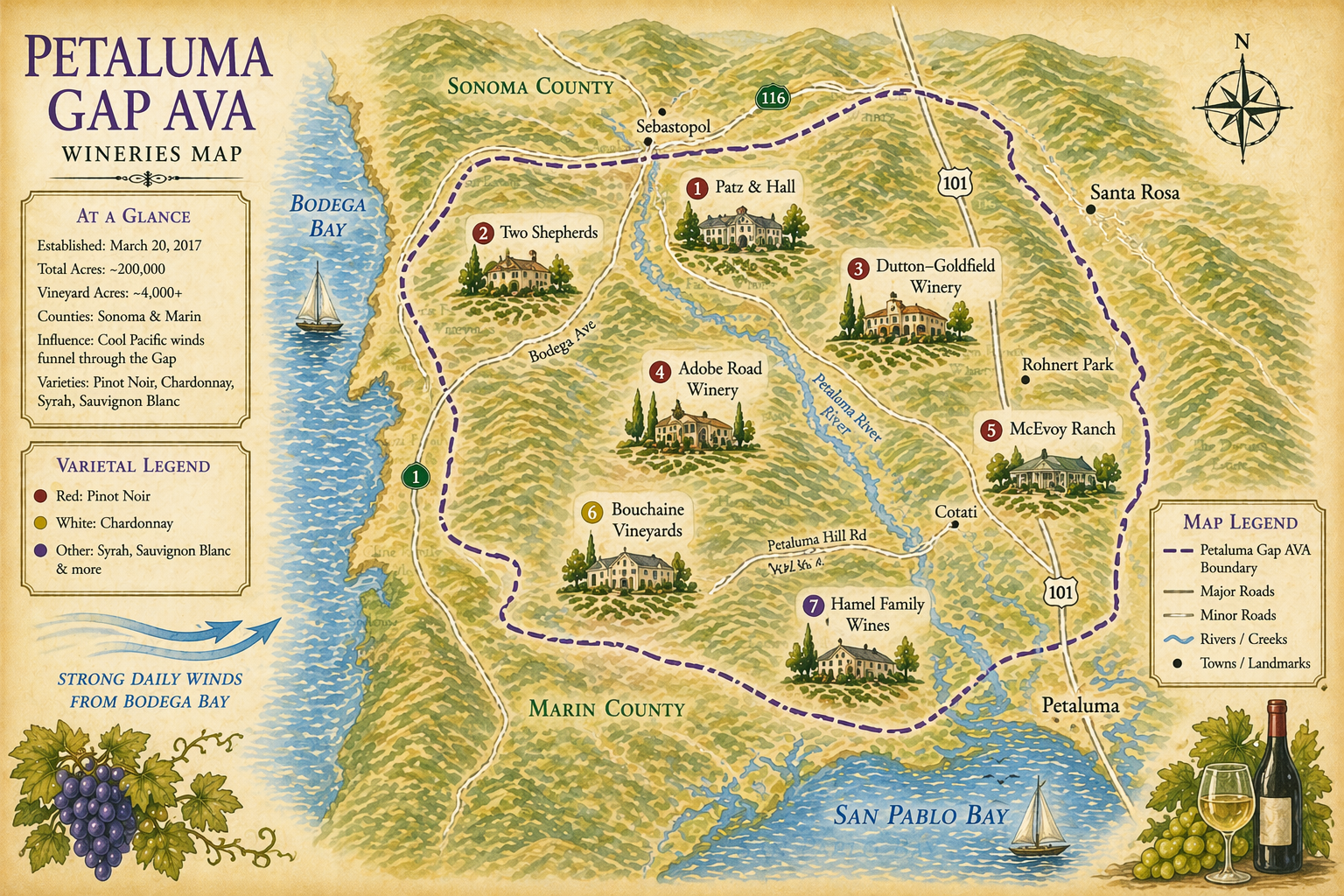 Established 2017 · Thermal wind corridor · Breach in Coast Range between Bodega Bay and San Pablo Bay · Wind-defined appellation · Silty clay loam and volcanic soils · Pinot Noir · Syrah · Petaluma and Sonoma County