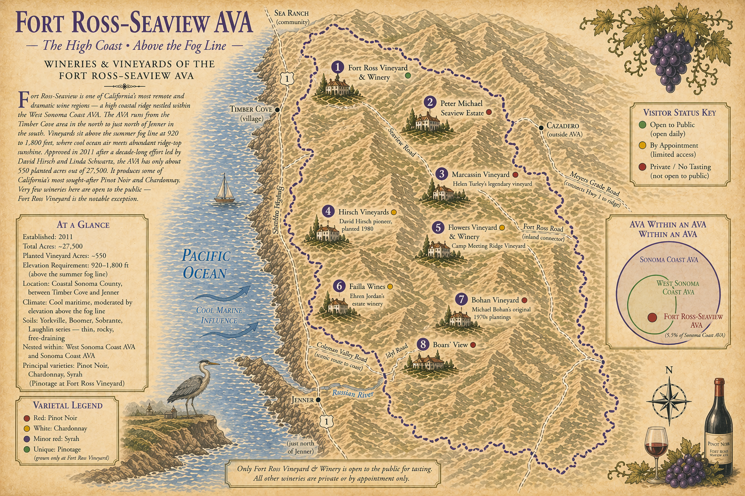 Established 2023 · Narrowly defined coastal AVA · Only vineyards genuinely shaped by Pacific Ocean proximity qualify · Rocky ancient soils · Temperatures rarely exceed 70°F · Pinot Noir · Chardonnay · Occidental, Freestone, Bodega Bay area