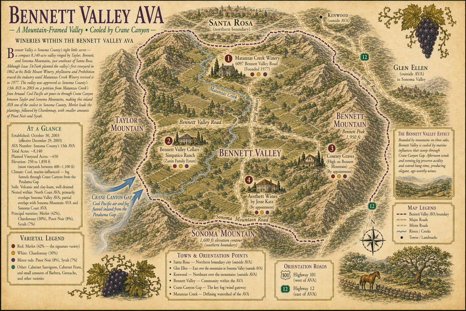 Established 1983 · Enclosed valley between three ridgelines · Volcanic soils · Petaluma Wind Gap influence · Merlot · Syrah · Chardonnay · Santa Rosa, Sonoma County