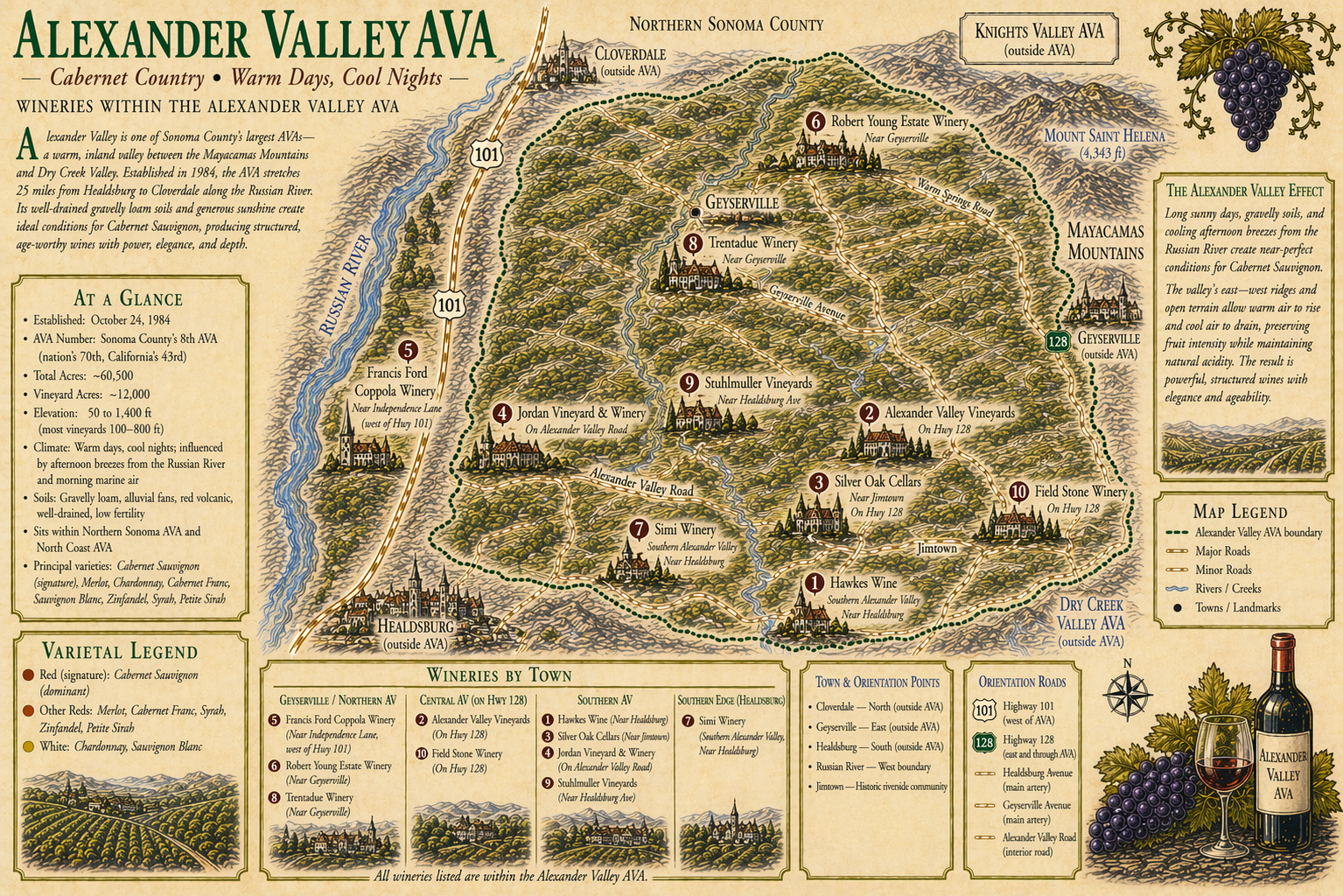 Established 1984 · 22-mile valley · Russian River corridor · Warm to hot climate · Cabernet Sauvignon and Merlot dominant · Old-vine Zinfandel heritage · Healdsburg to Cloverdale