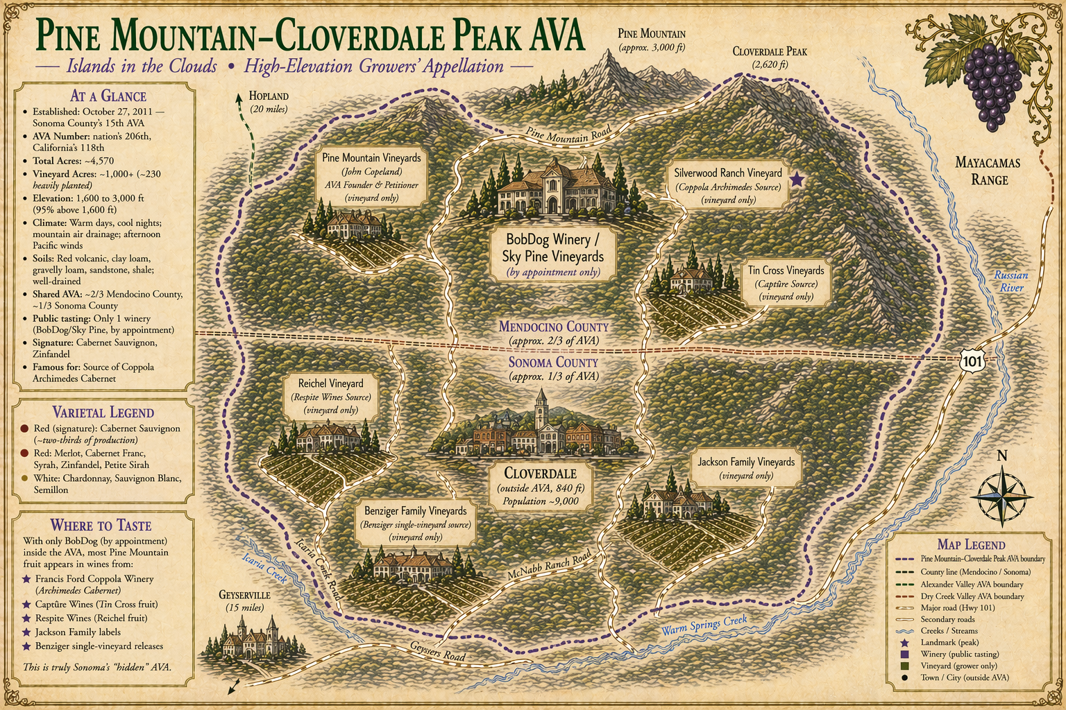 Established 2012 · Sonoma-Mendocino border · Elevations 1,600–2,700 ft · Volcanic soils · Cabernet Sauvignon and Bordeaux blends dominant · Extreme diurnal range