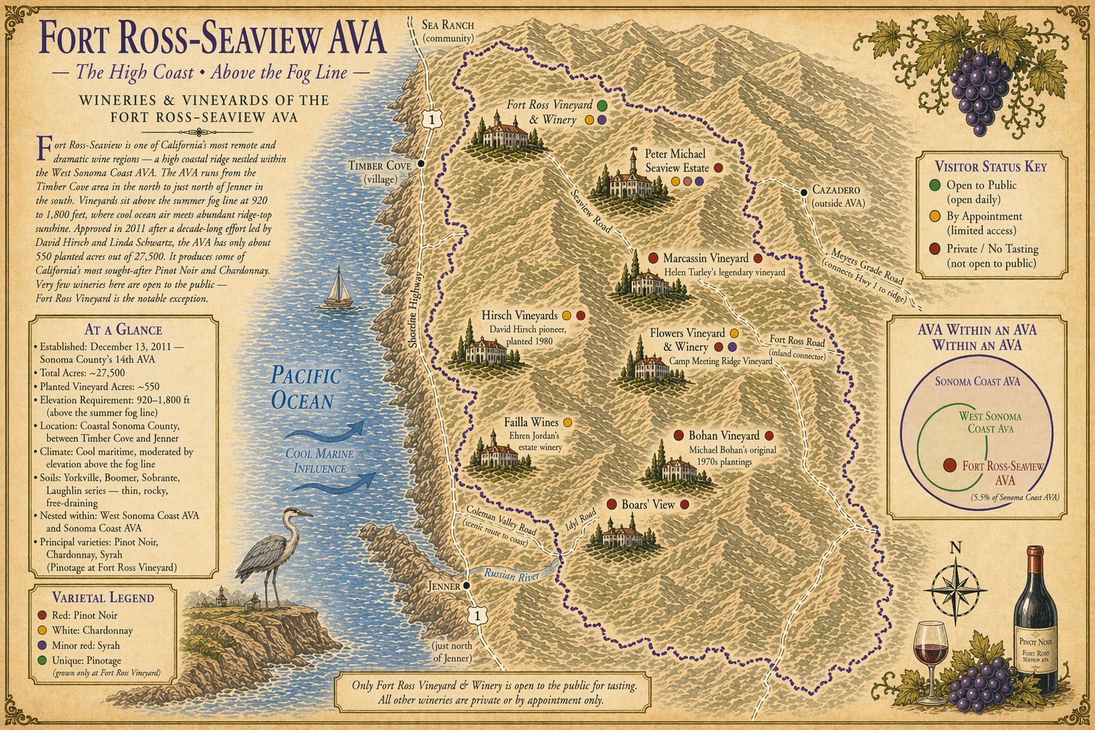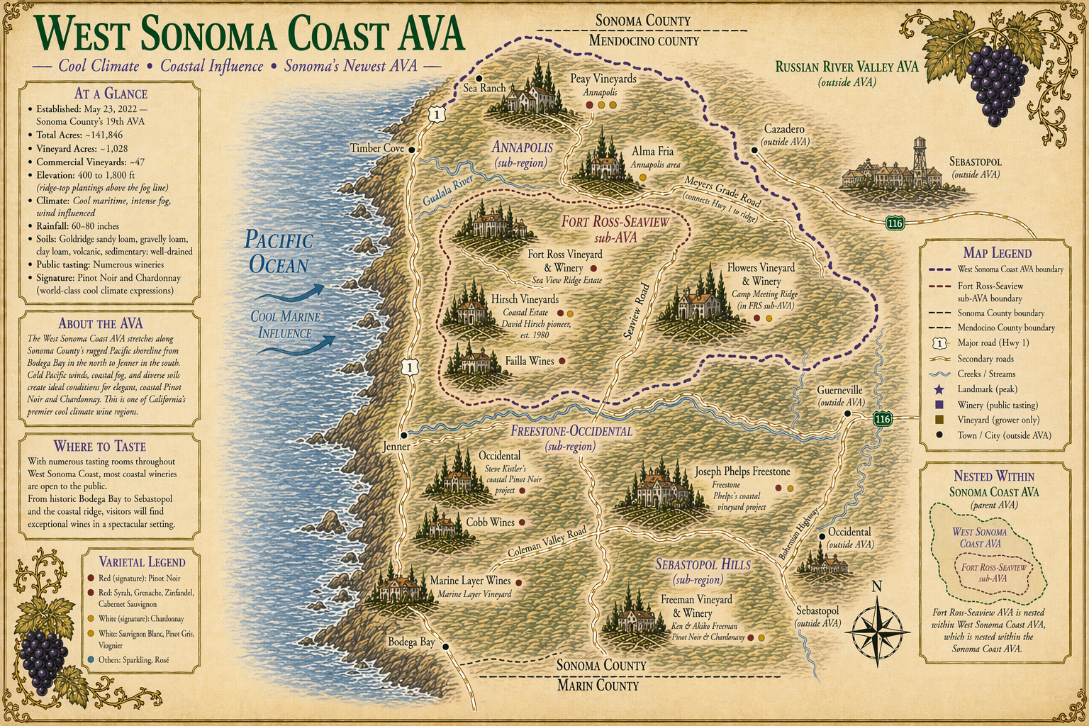 Established 2023 · Narrowly defined coastal AVA · Only vineyards genuinely shaped by Pacific Ocean proximity qualify · Rocky ancient soils · Temperatures rarely exceed 70°F · Pinot Noir · Chardonnay · Occidental, Freestone, Bodega Bay area