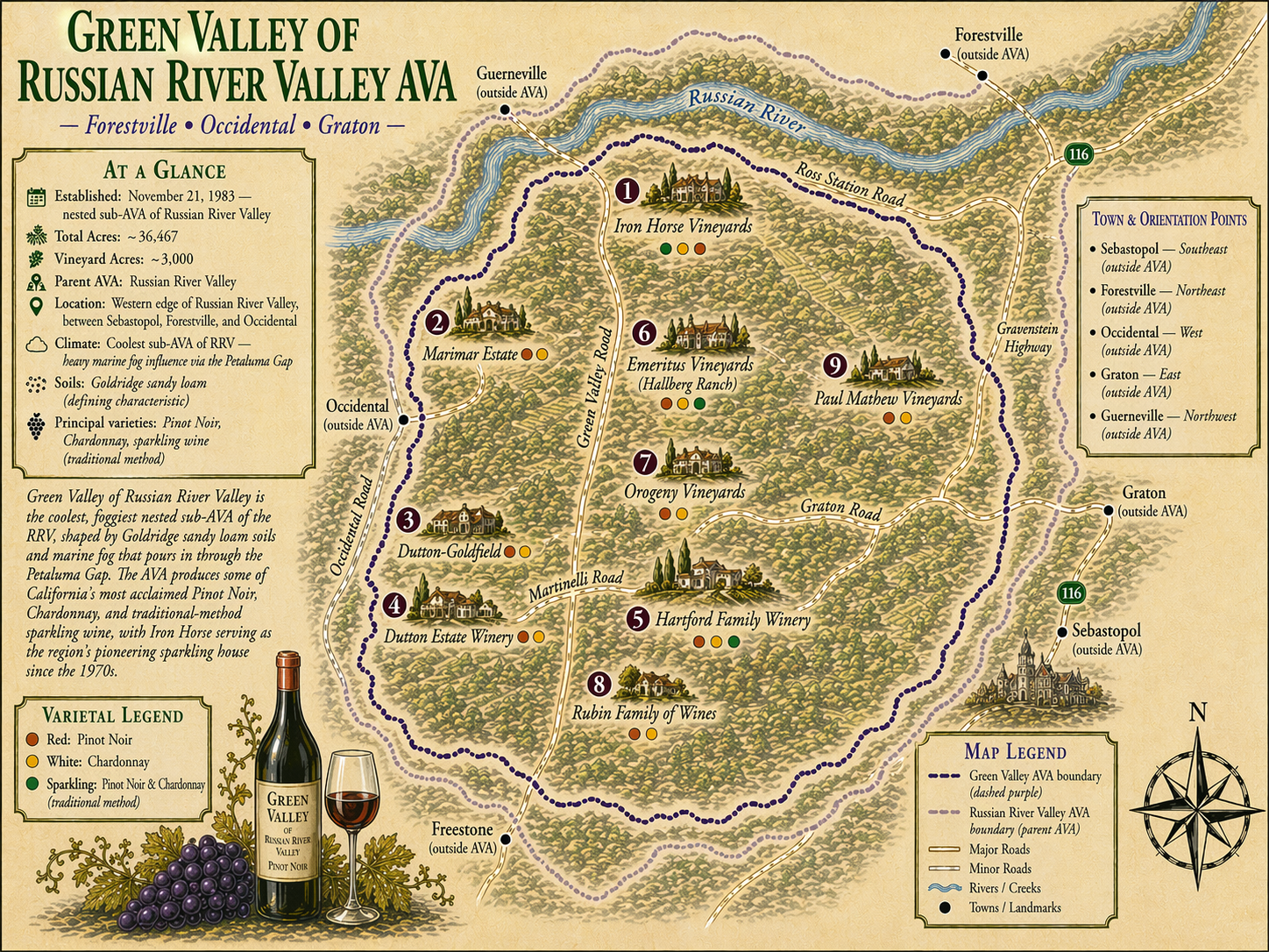 Established 1983 · Sub-AVA of Russian River Valley · Forestville and Graton area · Coldest and foggiest corner of RRV · Goldridge sandy loam soils · Shortest growing season in Sonoma · Pinot Noir · Chardonnay · Sparkling wine