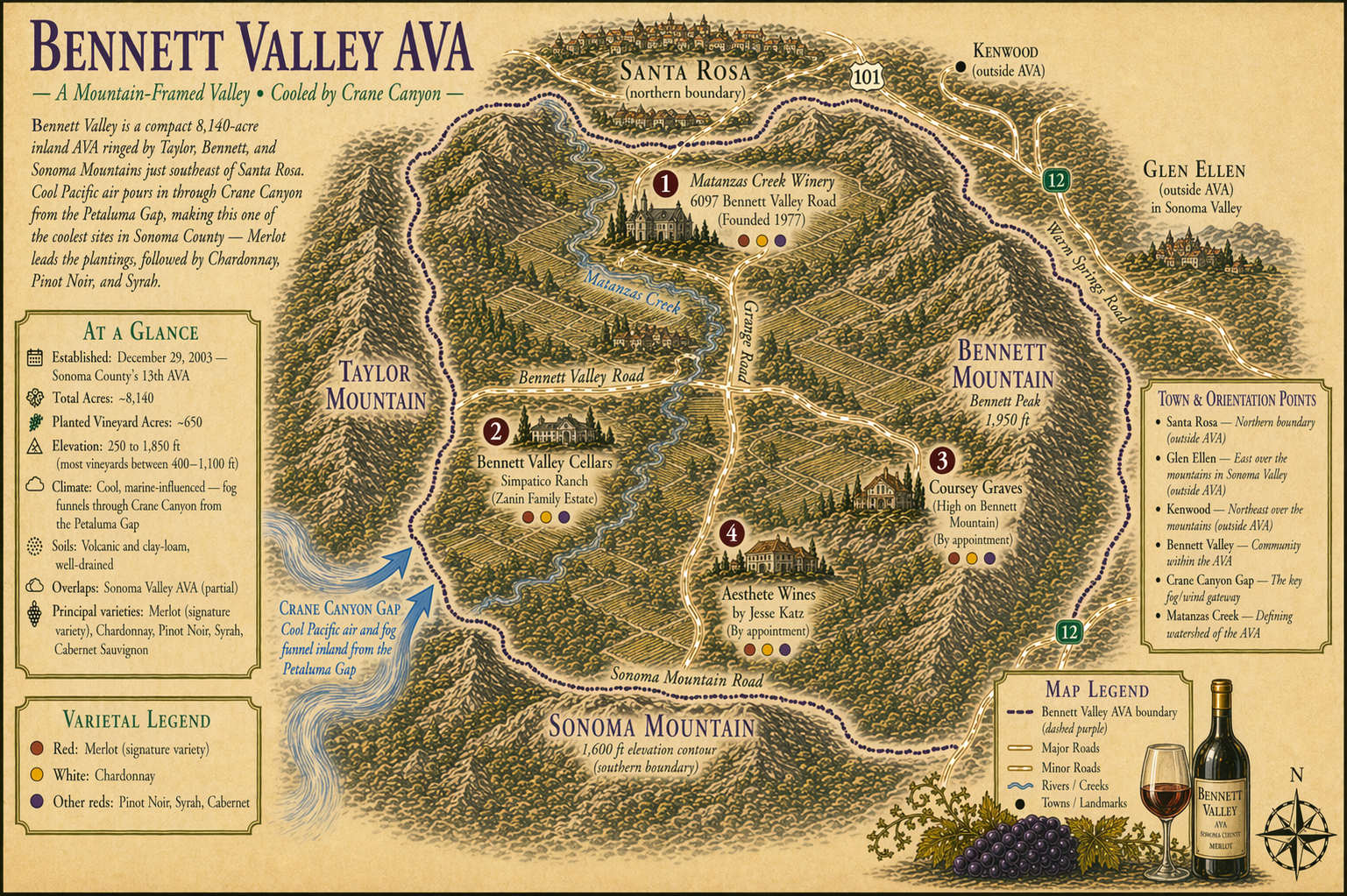 Established 1983 · Enclosed valley between three ridgelines · Volcanic soils · Petaluma Wind Gap influence · Merlot · Syrah · Chardonnay · Santa Rosa, Sonoma County