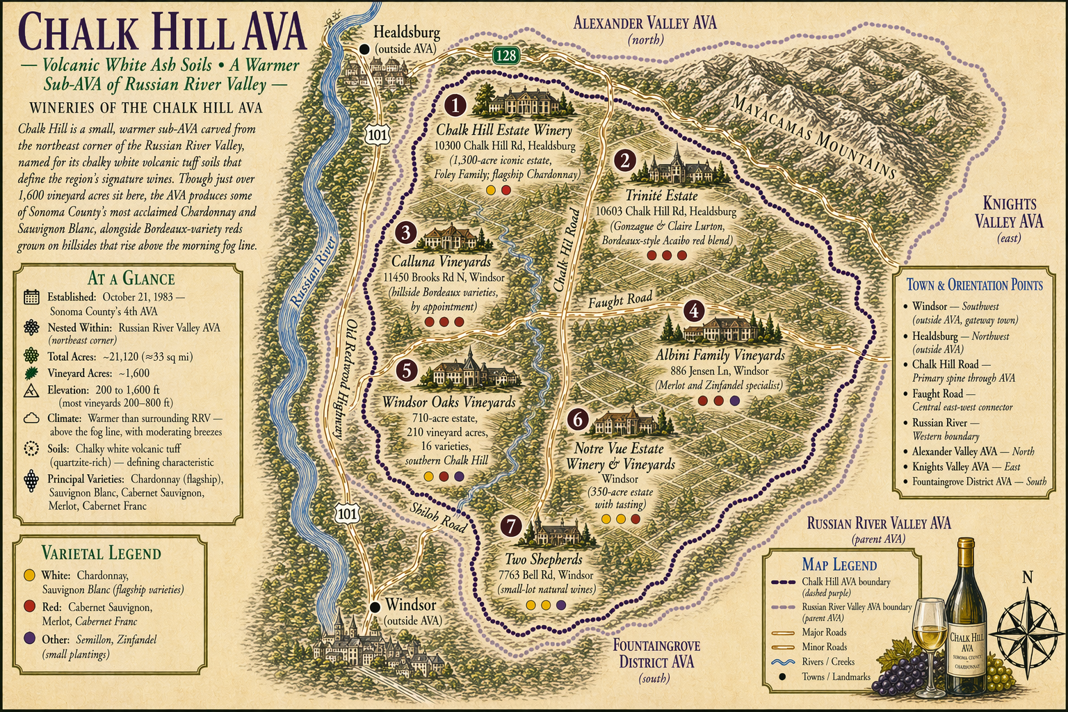 Established 1983 · Northeastern edge of Russian River Valley · White volcanic ash soils · Warmer and more sheltered than RRV proper · Chardonnay · Sauvignon Blanc · Cabernet Sauvignon · Windsor area, Sonoma County
