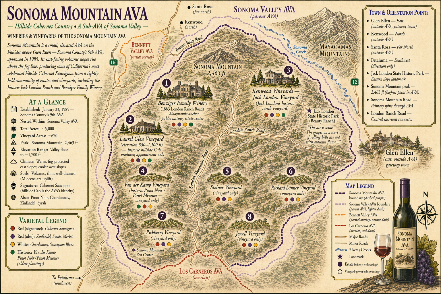 Established 1985 · Western edge of Sonoma Valley · Above the marine fog line · Ancient volcanic soils · Warm days, cool nights · Cabernet Sauvignon · Zinfandel · Merlot · Glen Ellen and Kenwood area, Sonoma County