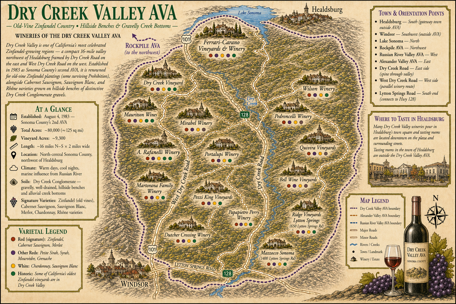 Established 1983 · 16 miles long, 1 mile wide · Benchland alluvial soils · Zinfandel and Sauvignon Blanc dominant · Old-vine heritage · Northwest of Healdsburg