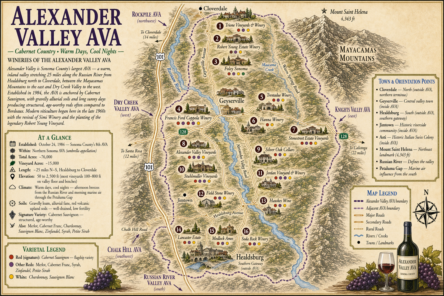 Established 1984 · 22-mile valley · Russian River corridor · Warm to hot climate · Cabernet Sauvignon and Merlot dominant · Old-vine Zinfandel heritage · Healdsburg to Cloverdale